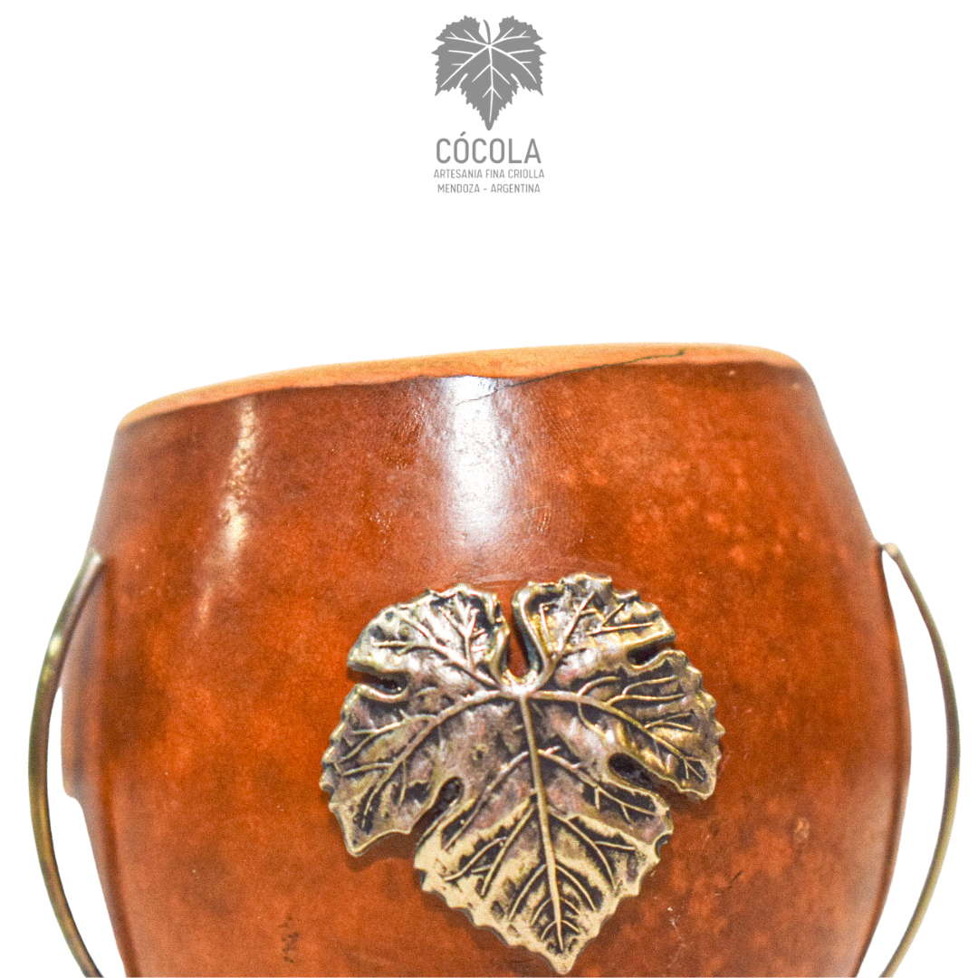 Luce un delicado detalle de hoja de parra en alpaca —símbolo de identidad mendocina— y una base del mismo material que aporta estabilidad y un acabado elegante.